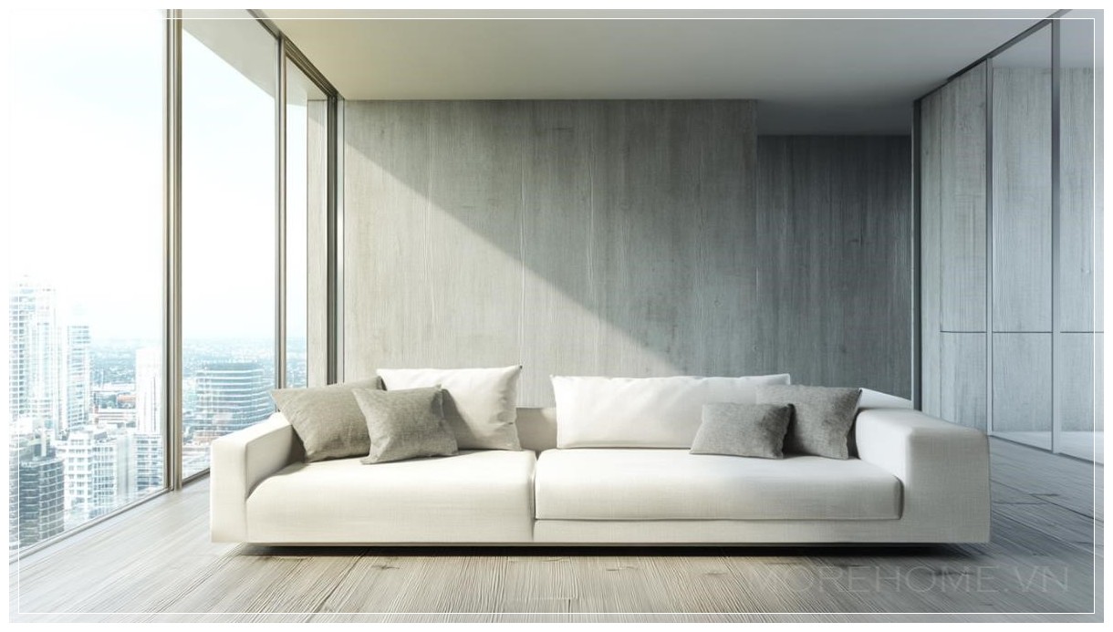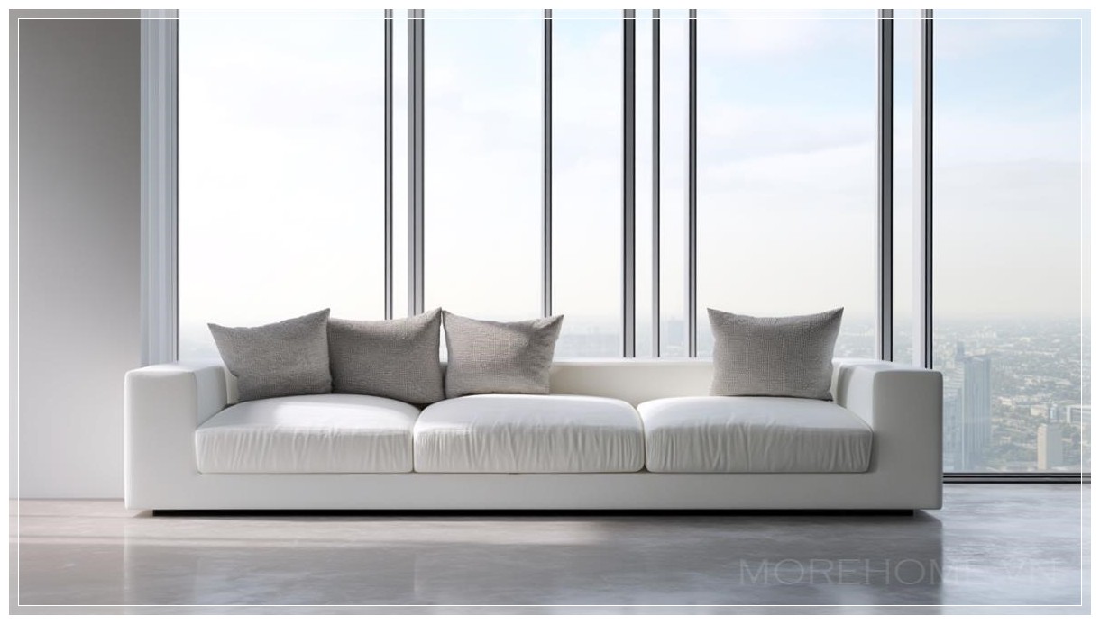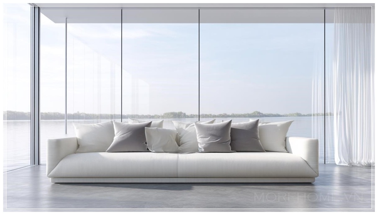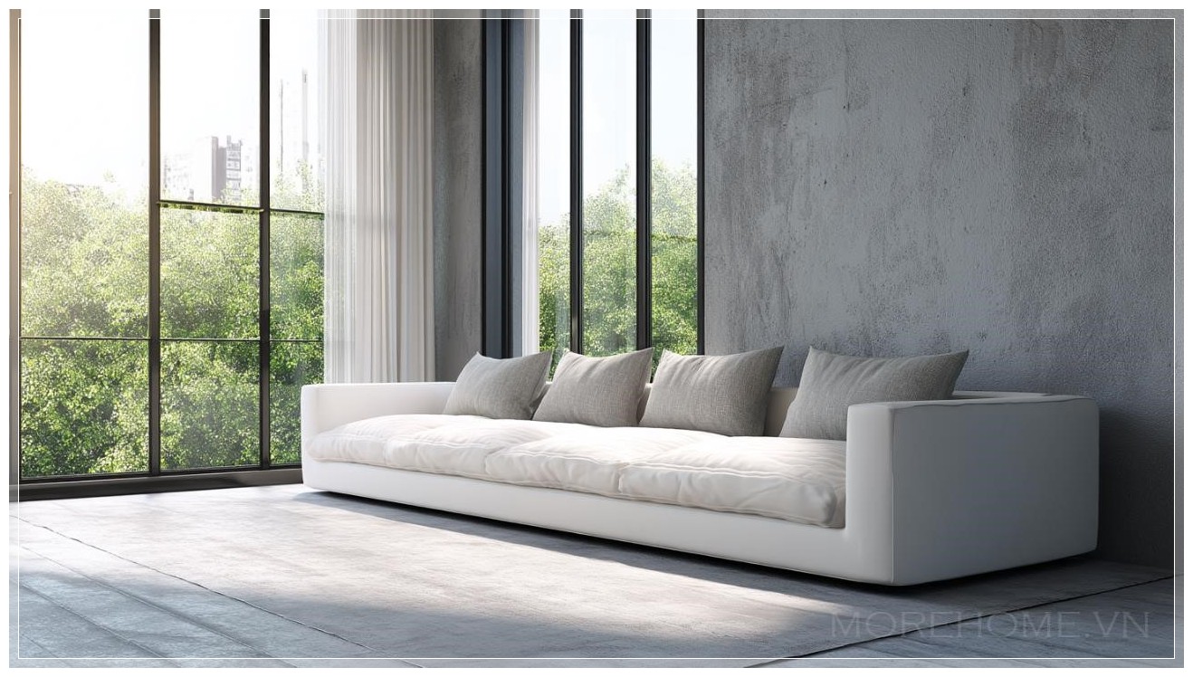 Sofa trắng tối giản với đường nét sạch sẽ, thiết kế thấp, đệm xám mềm mại, đặt trong một căn phòng đơn sắc với cửa sổ từ sàn đến trần, ánh sáng tự nhiên chiếu sáng, phong cách tạp chí kiến trúc, siêu thực. Liên hệ: https://zalo.me/morehomevietnam