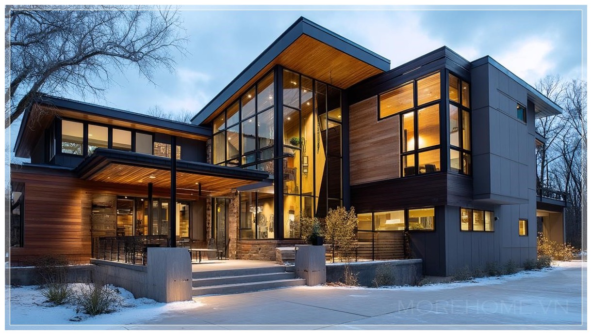 Thiết kế hiện đại cho nhà ở với không gian mở, sử dụng các vật liệu như kính, bê tông, và kim loại. Nội thất tối giản với các đường nét sắc sảo, kết hợp cùng ánh sáng tự nhiên. Màu sắc chủ đạo là trắng, xám và đen, tạo nên không gian thanh lịch và tinh tế. Các yếu tố như cửa sổ lớn, phòng khách rộng rãi và khu vực bếp được bố trí khoa học, tối ưu hóa sự tiện nghi và thoải mái.