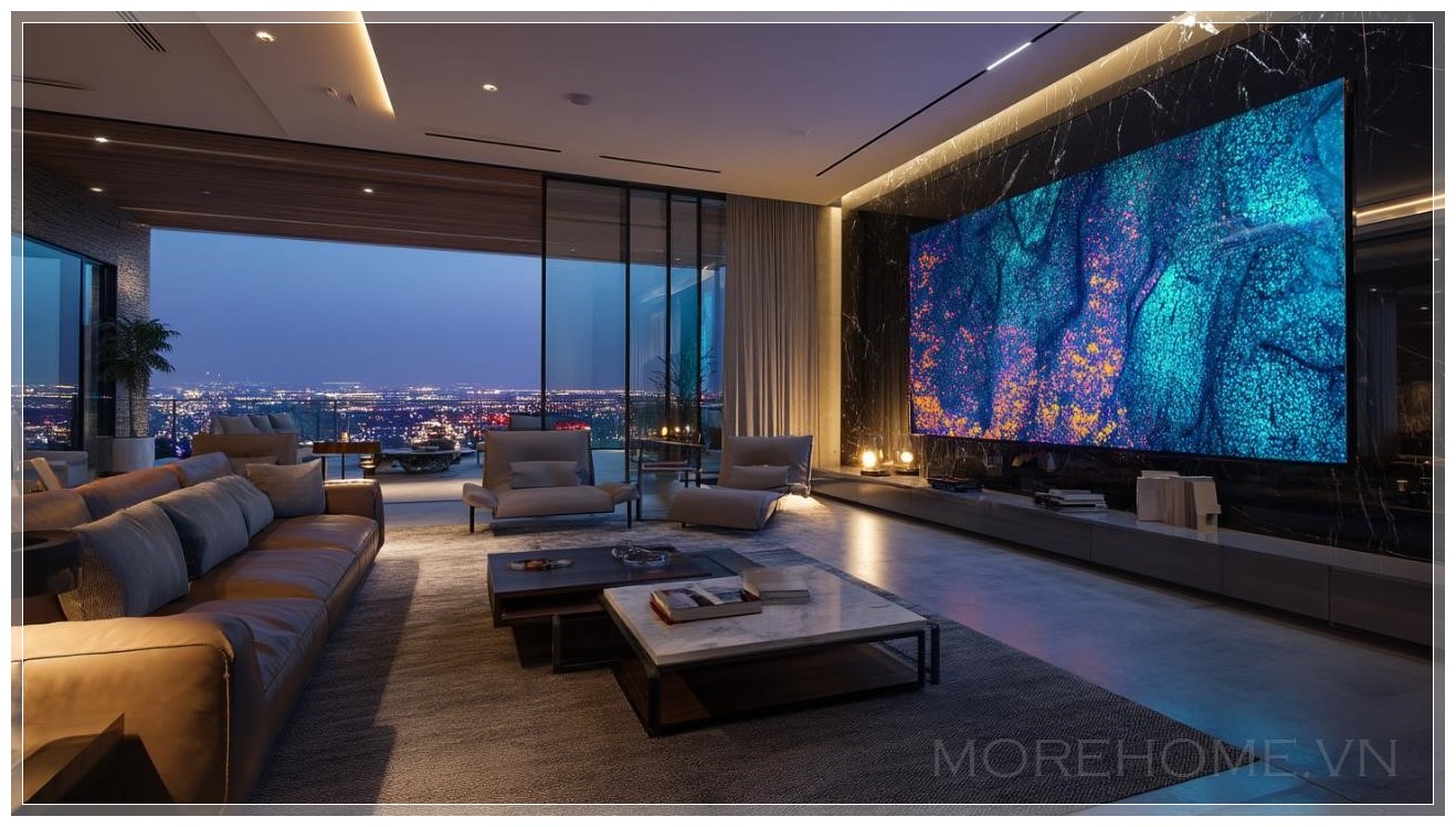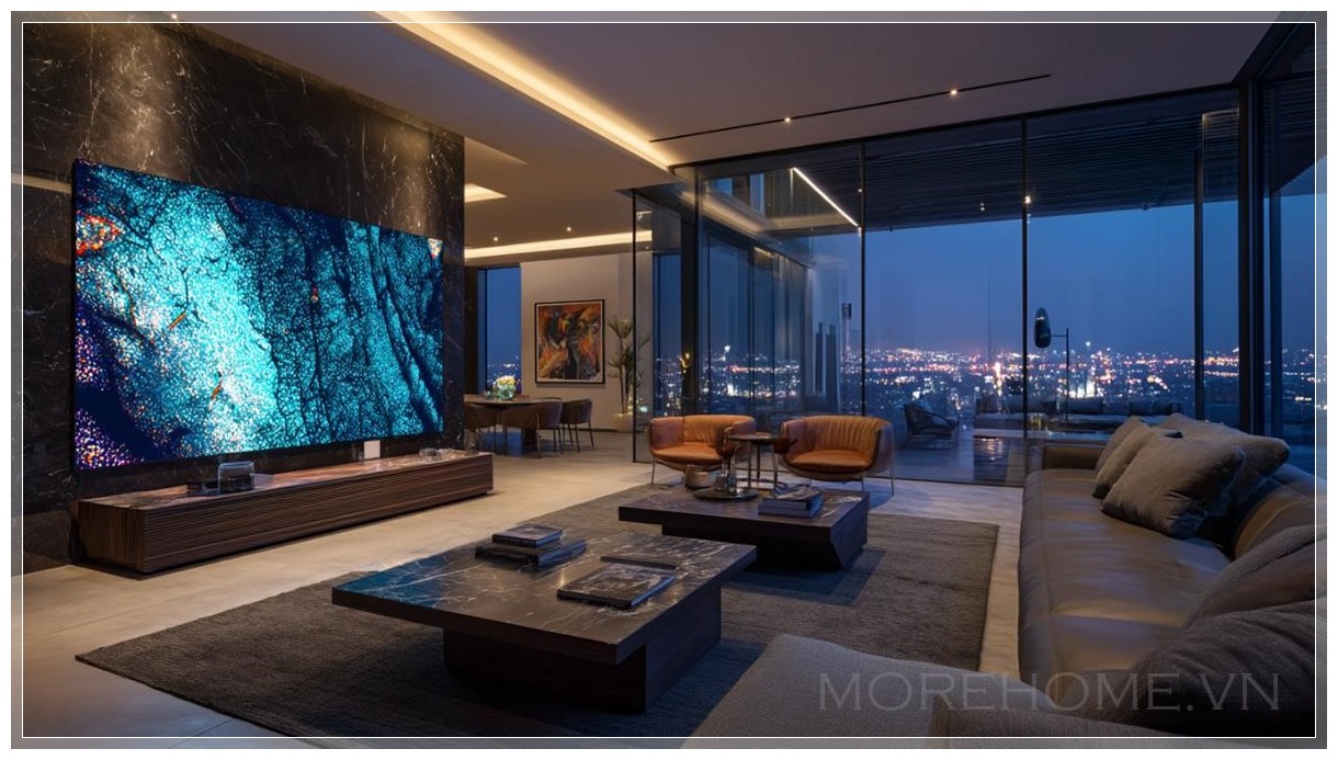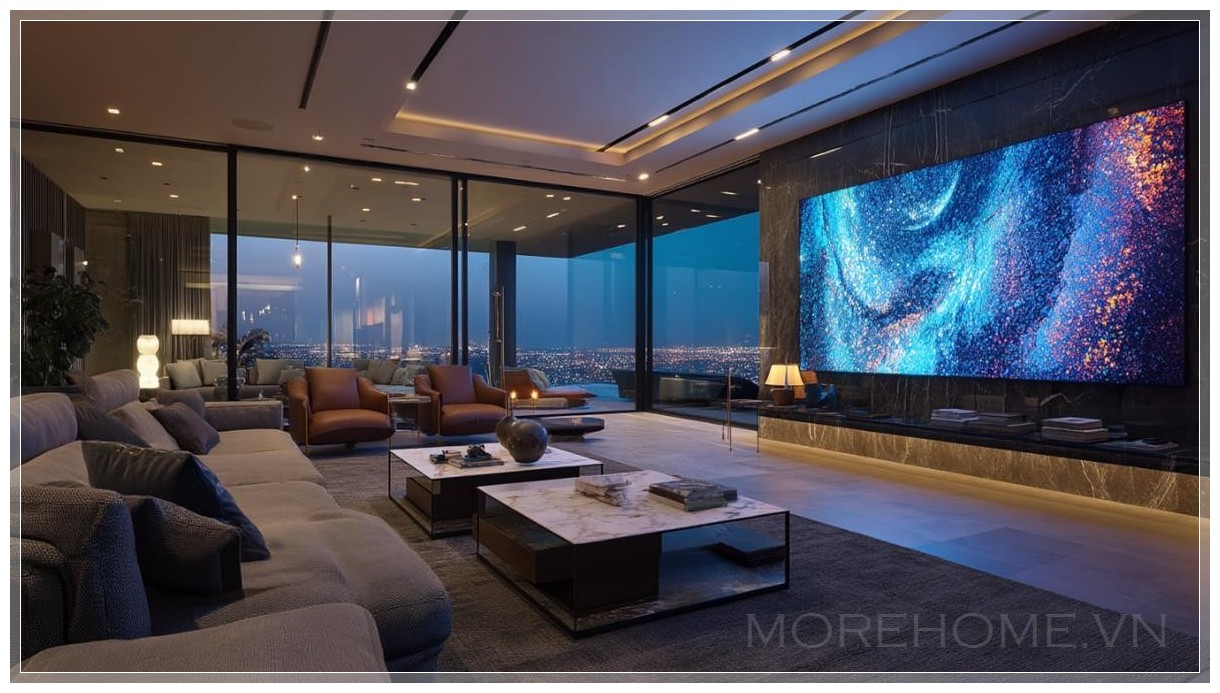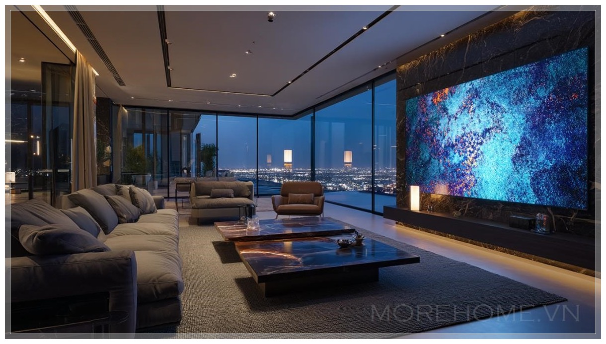 Biệt thự cao cấp có sàn phẳng rộng, trên tường là chiếc TV lớn 100 inch màn hình phẳng, màn hình TV hiển thị hoa văn trừu tượng với tông màu xanh lam pha lẫn cam. Những chiếc ghế sofa bằng da đối diện với TV, bàn cà phê gỗ óc chó với mặt bàn đá cẩm thạch đơn giản. Cảnh đêm mát mẻ với ánh sáng môi trường nhẹ nhàng, cửa sổ lớn từ sàn đến trần, mang lại tầm nhìn toàn cảnh thành phố vào ban đêm. Sàn nhà làm bằng microcement mờ, với thảm tối màu có kết cấu tinh tế. Các chi tiết kim loại như chân đèn mạ nickel chải và chân ghế kim loại mảnh mai thêm phần sang trọng hiện đại. Cách bài trí này tôn vinh chiều sâu của không gian. Ánh sáng chân thật, độ phân giải 8K, ánh sáng điện ảnh.